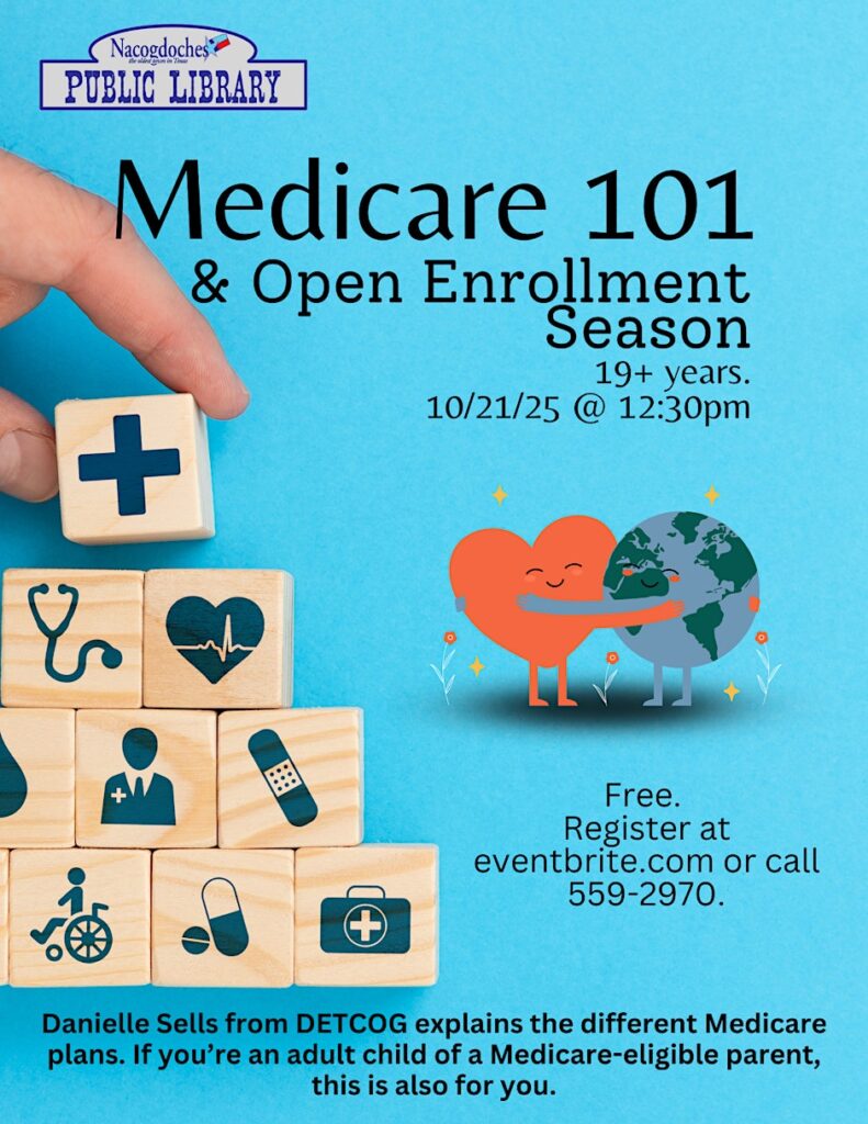The enrollment period for Medicare opens in October. Danielle Sells will explain the various options available for Medicare coverage. This program is ideal for people nearing eligibility age, people currently on Medicare looking to make a change, or their adult children. Light snacks will be served. Feel free to bring your own lunch. For adults ages 19 & up.